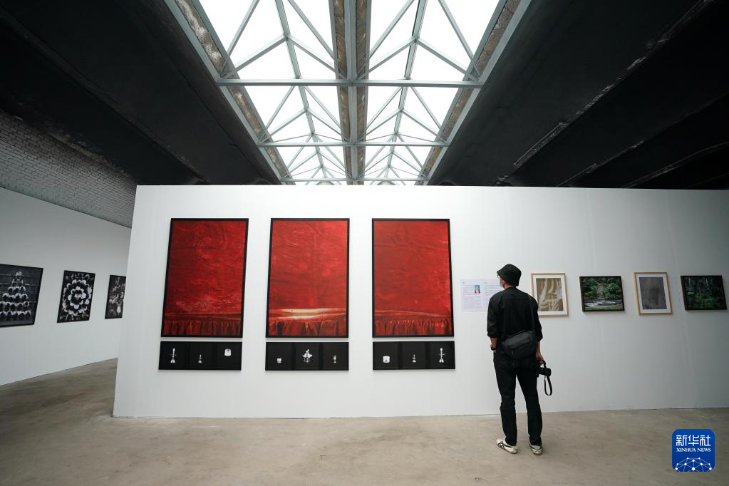 9月19日,参观者在第22届平遥国际摄影大展上观看展出作品。新华社记者 詹彦 摄