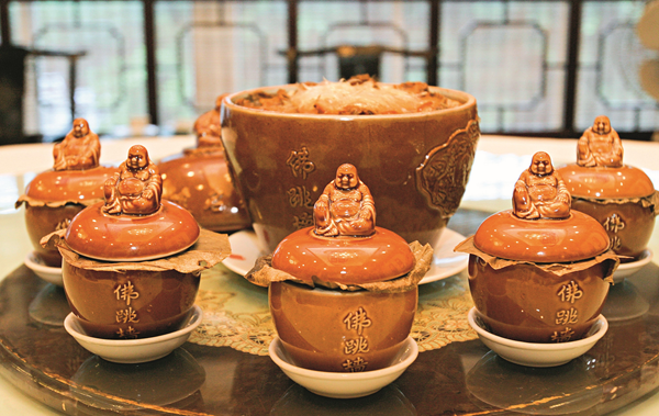传统闽菜佛跳墙,原名福寿全。正宗的佛跳墙在开坛时带有甜味的浓郁荤香,别具风味,令人难忘,有“坛启荤香飘四邻,佛闻弃禅跳墙来”之说,故名“佛跳墙”。