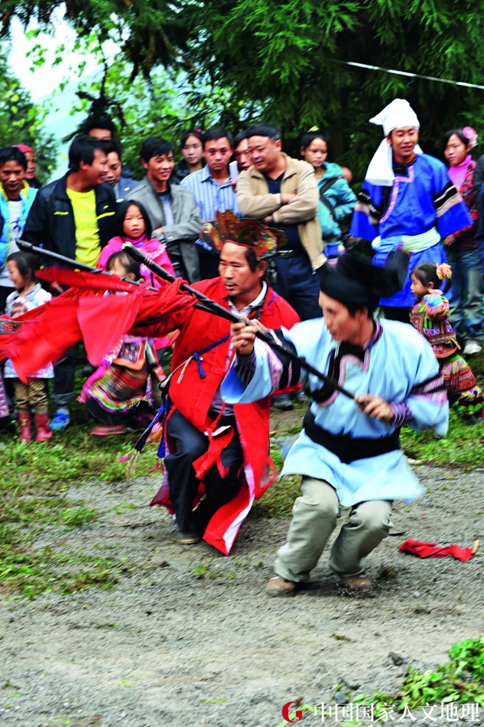 ▼ 正在进行武教戏表演的“喇叭苗”。生活在晴隆、普安两县的“喇叭苗”,以其衣袖呈喇叭状而得名。这种宽衽大袖的服饰,具有浓郁的明代服饰特点。
