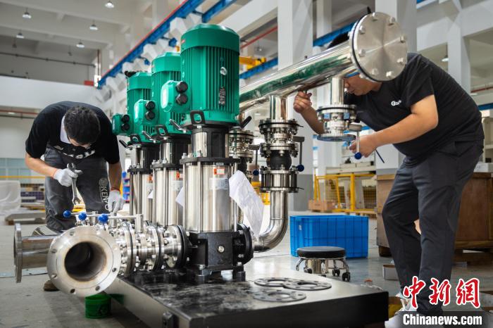 工作人员组装用于捐赠的水泵。章毅 摄