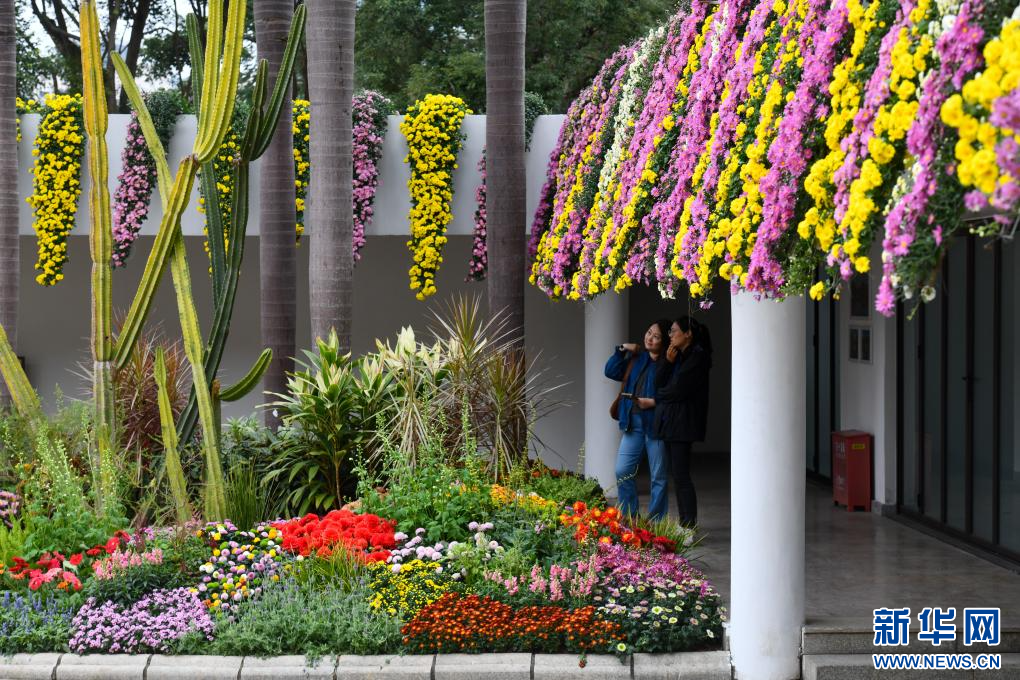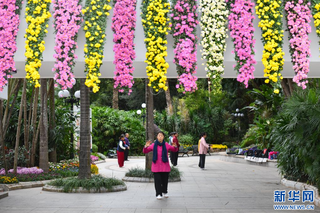 12月19日,群众在深圳东湖公园的菊花花瀑下休闲健身。