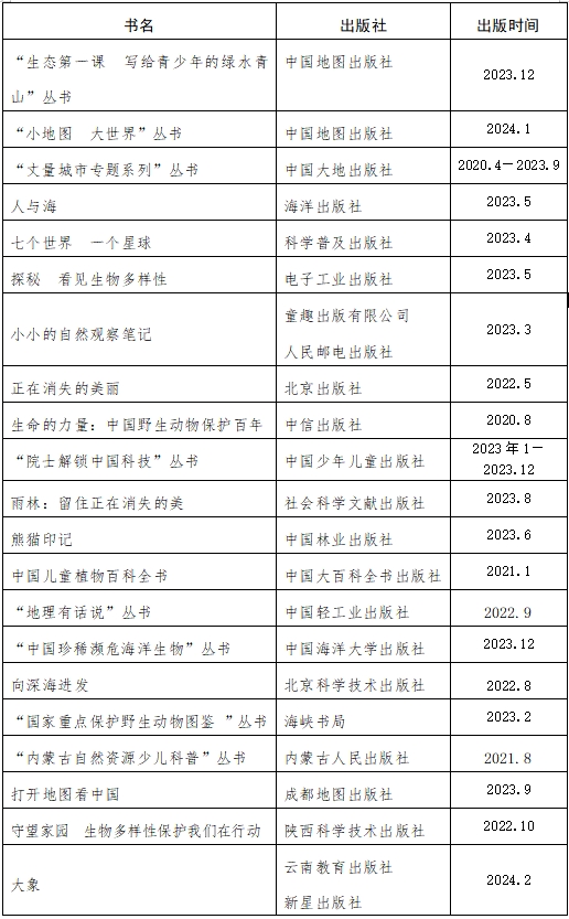 全国41家出版社报送自然资源相关图书总计144本,经过各出版社自荐、宣教中心初评和专家现场评议,最终评出36本自然资源好书。图书种类多样,包括科普图书、画册、研究专著、译著、地图集和文学作品等;内容丰富多彩,主题包括人与自然和谐共生,动植物、湿地、生物多样性保护,海洋科学与海洋知识科普,地球与地理科学知识,人文地理,国土空间规划,公园城市建设,自然文化和地图文化等。
