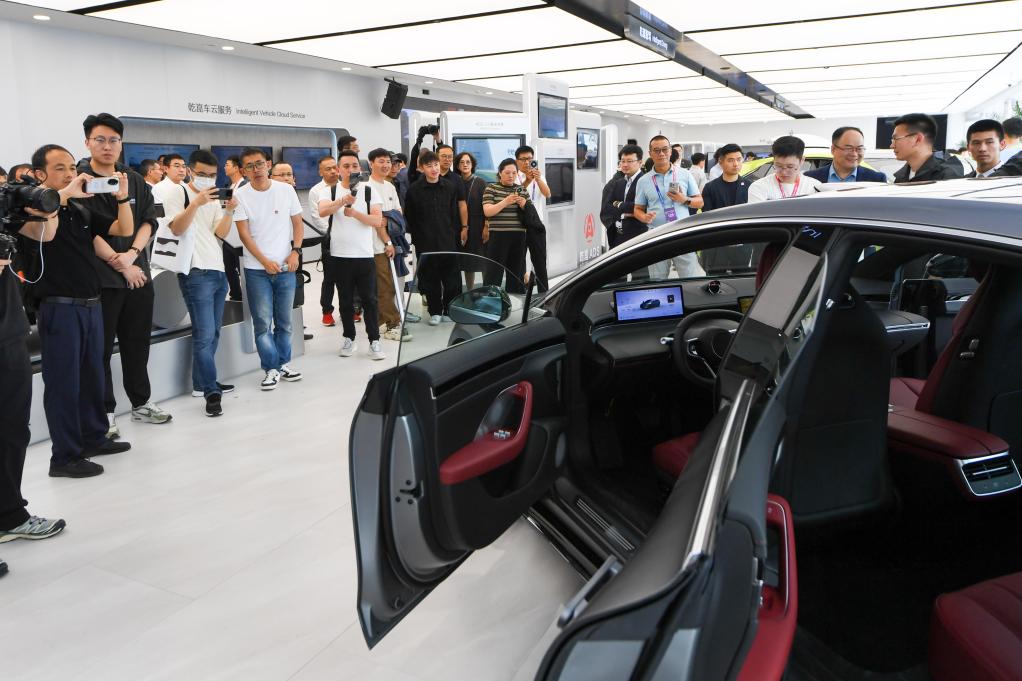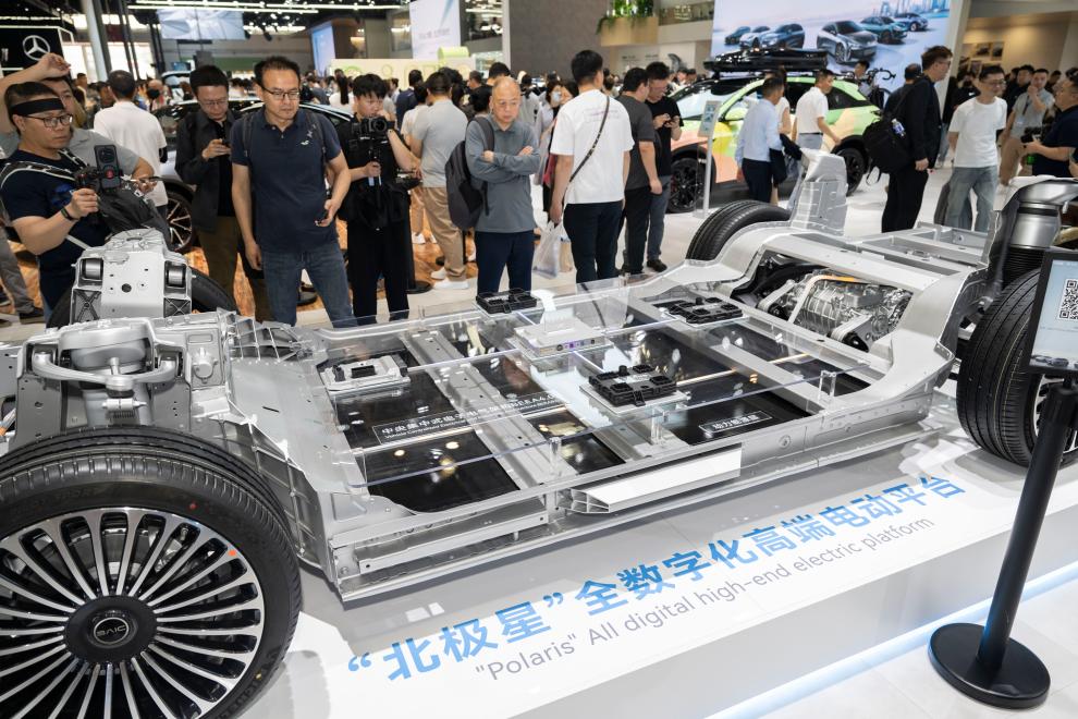 4月25日,在北京中国国际展览中心顺义馆举行的2024北京车展上,观众在北汽集团观看“北极星”全数字化高端电动平台。