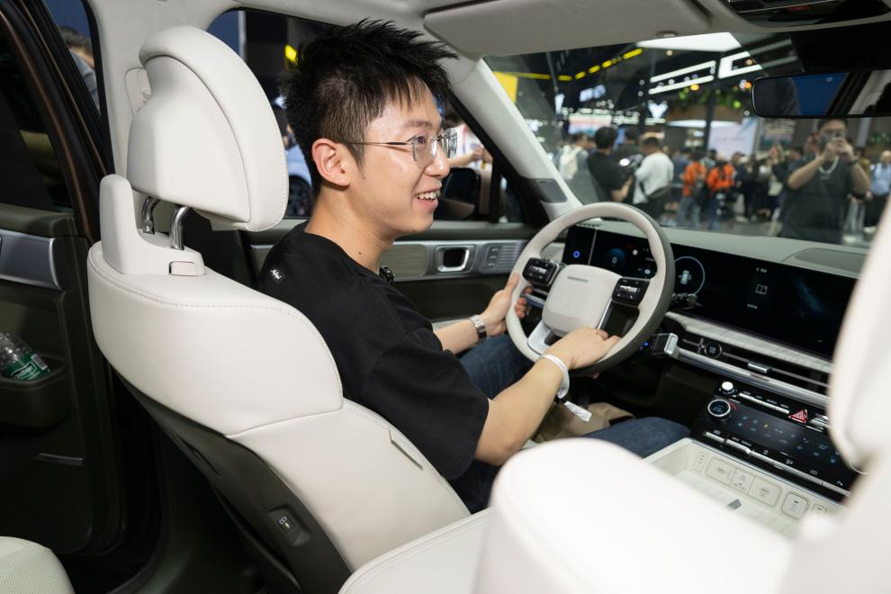 4月25日,在北京中国国际展览中心顺义馆举行的2024北京车展上,参观者观看一款新能源汽车的智能车控系统演示。