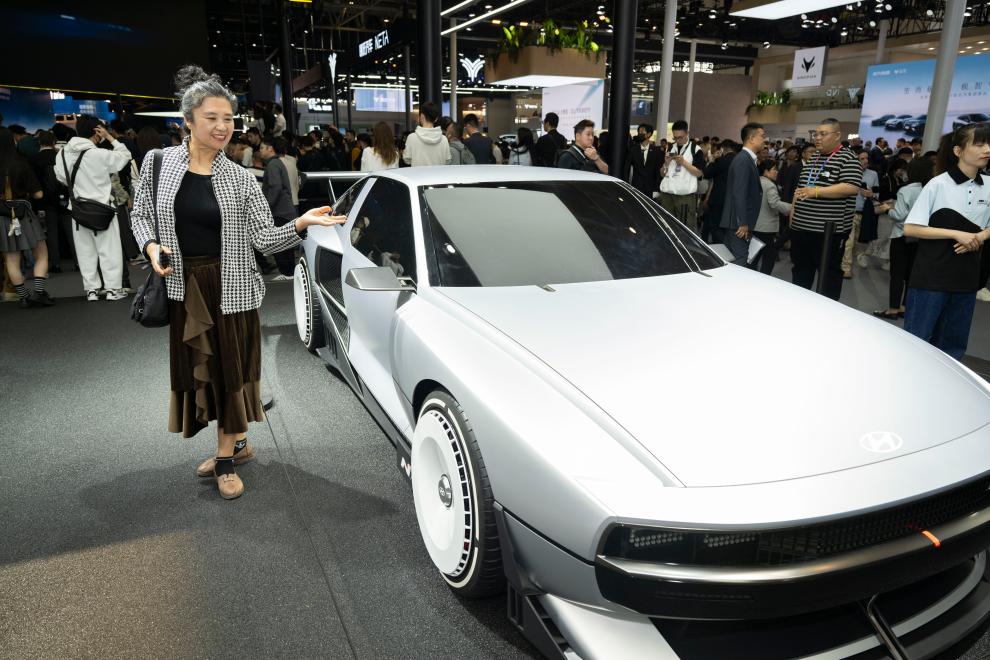 4月25日,在北京中国国际展览中心顺义馆举行的2024北京车展上,观众参观现代汽车的高性能氢燃料电池混合动力概念车N Vision 74。