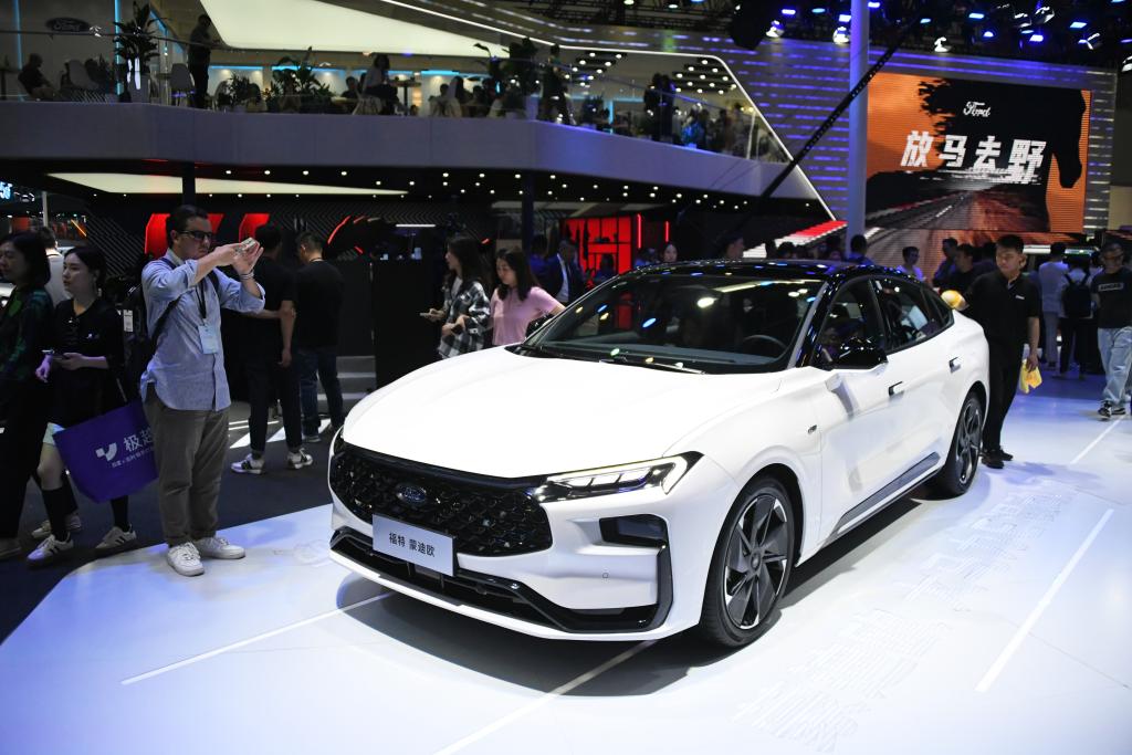 4月25日,在北京中国国际展览中心顺义馆举行的2024北京车展上,人们在车展现场观看福特蒙迪欧。