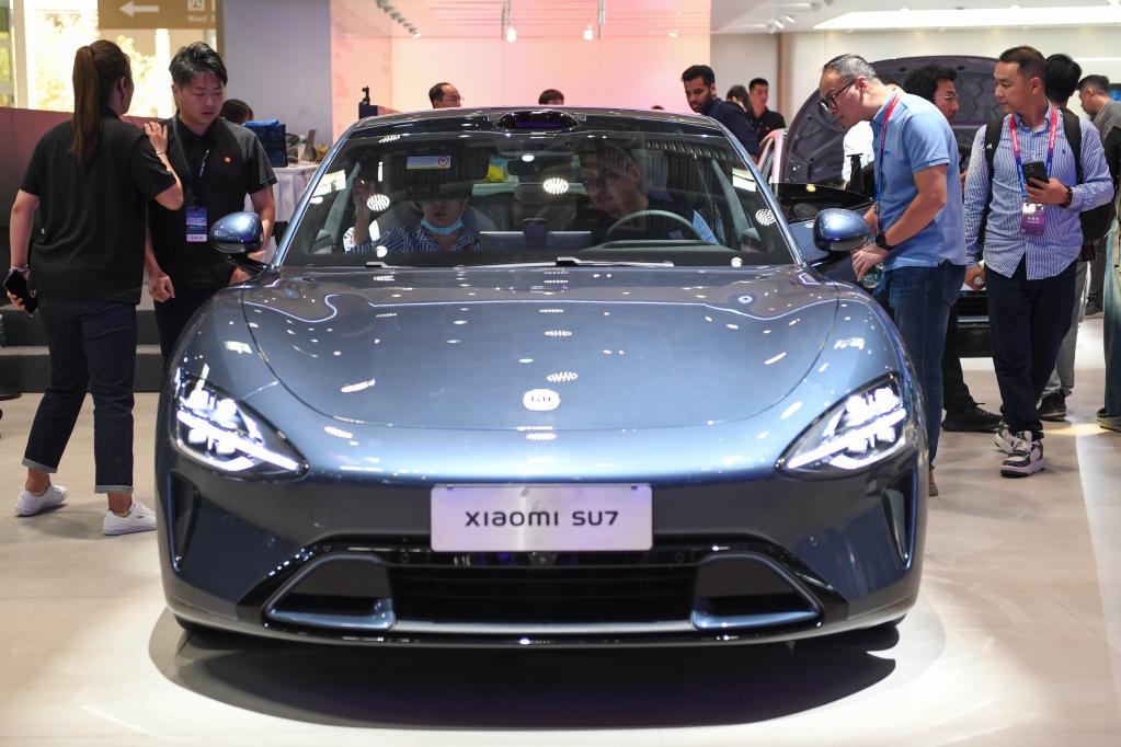 4月25日,在北京中国国际展览中心顺义馆举行的2024北京车展上,参观者观看展出的小米SU7新能源汽车。