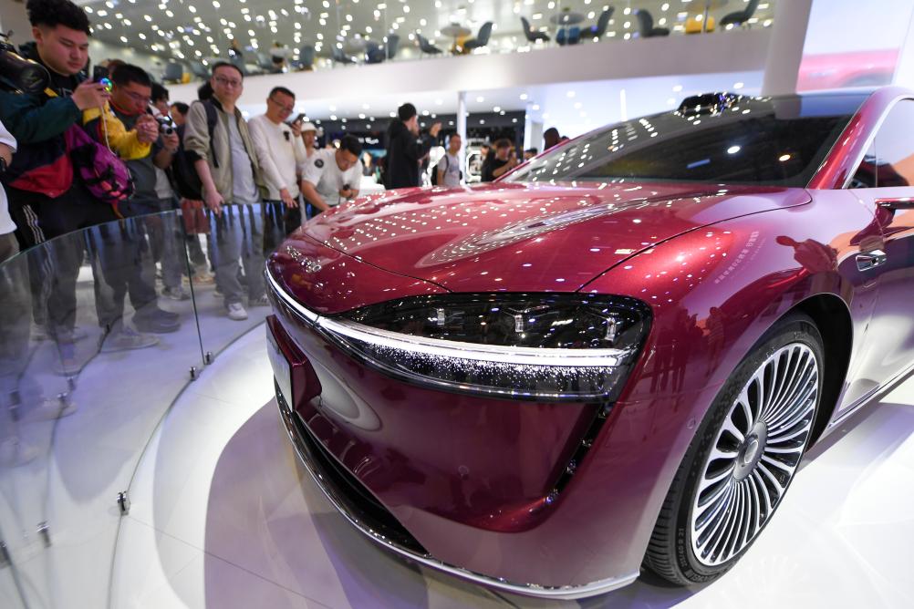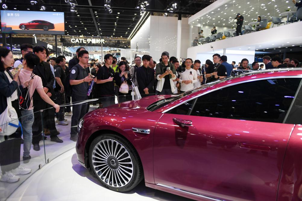 4月25日,在北京中国国际展览中心顺义馆举行的2024北京车展上,参观者观看车展上发布的新款车型享界S9。