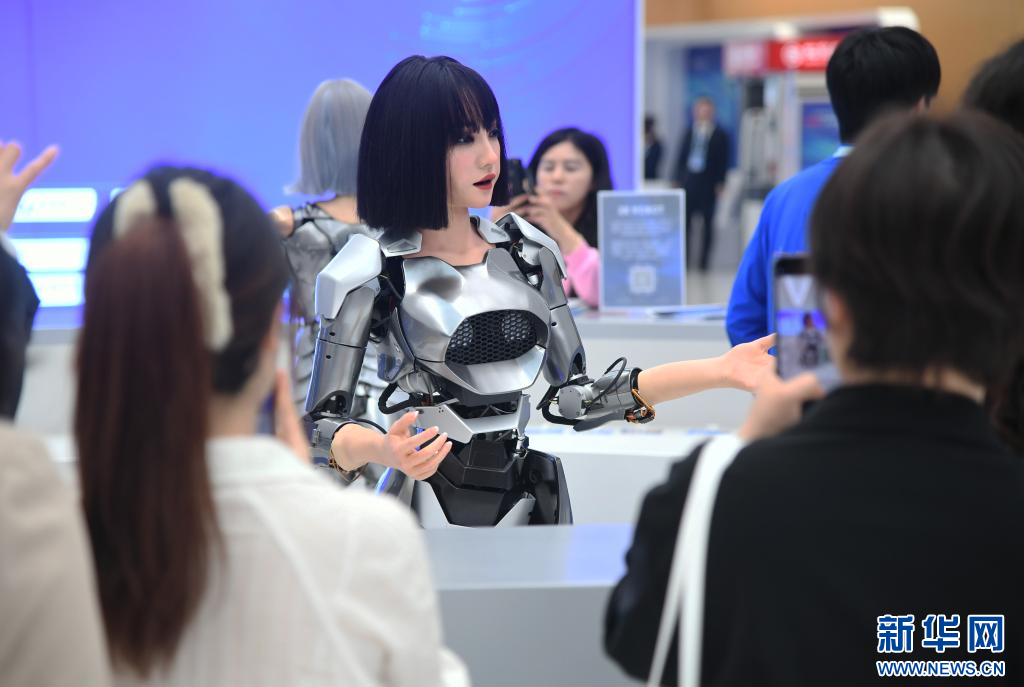 2024年4月27日,人们在中关村国际创新中心咨询台拍摄仿生人形机器人。新华社记者 任超 摄