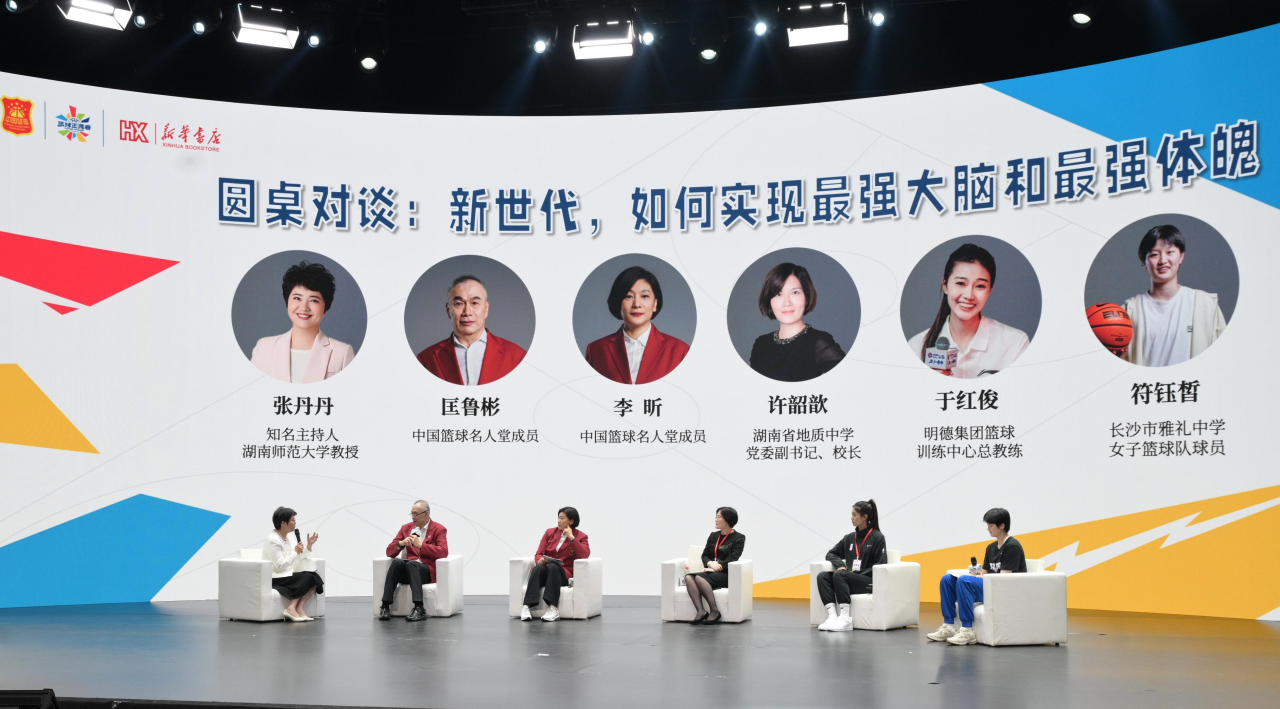 在圆桌对谈环节,中国篮球名人堂成员匡鲁彬、李昕与湖南省地质中学党委副书记、校长许韶歆,明德集团篮球训练中心总教练于红俊,雅礼中学女篮运动员符钰皙围绕“户外体育与室内学习时间分配”“运动与阅读相互促进”“体教融合的实践与探索”等议题进行了分享与交流。