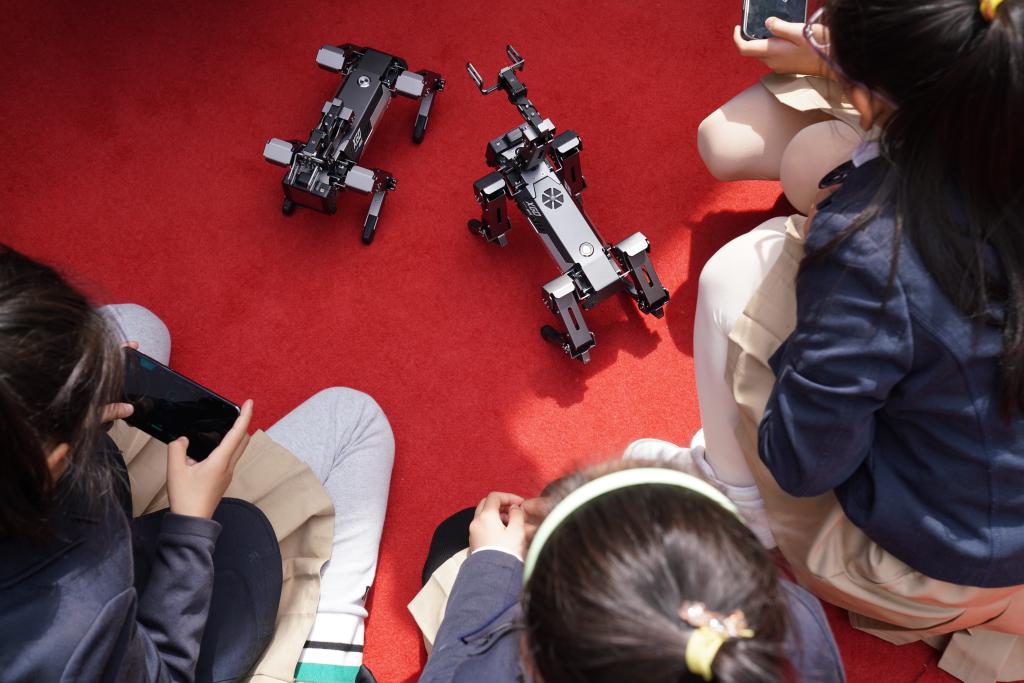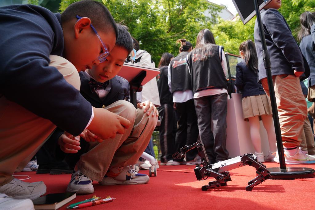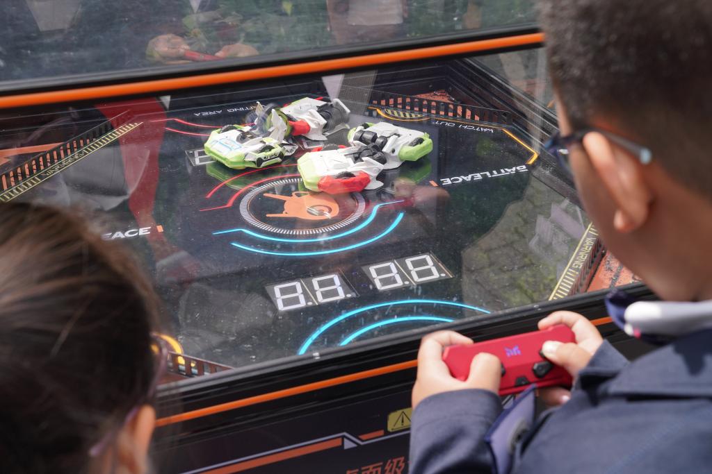 5月13日,在哈尔滨工业大学学生创新创业成果展现场,小学生在参与体验桌面竞技机器人项目。