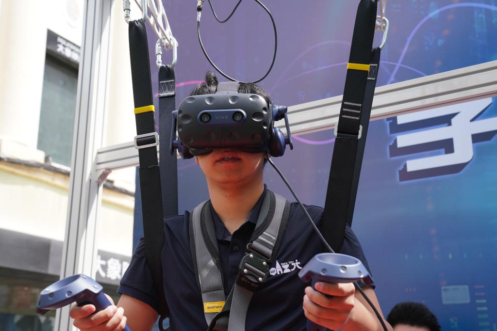 5月13日,在哈尔滨工业大学学生创新创业成果展现场,参展团队成员展示沉浸式微低重力体验系统。