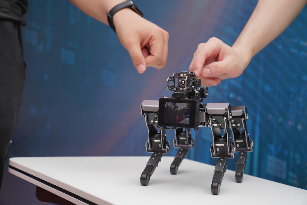 5月13日,在哈尔滨工业大学学生创新创业成果展现场,参展团队成员展示一款机器人。