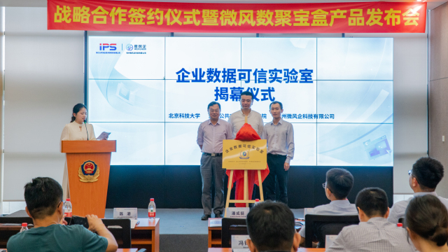 浙江公共安全技术研究院院长陈港、微风企总经理潘成挺、北京科技大学计算机系博士生导师王昭顺等出席签约仪式,与来自科技公司、企服行业、金融机构等多行业的企业嘉宾代表一同见证了战略合作的签署,并见证“企业数据可信实验室”揭牌落成。
