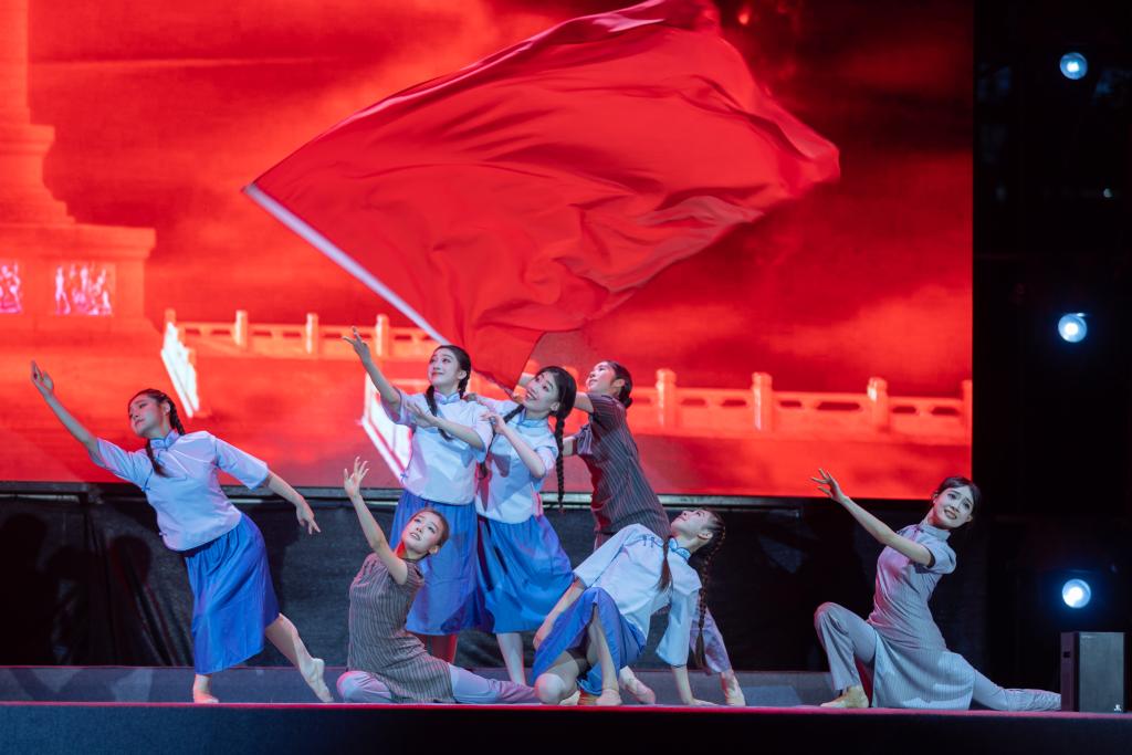 7月2日,上海师范大学音乐学院学生表演歌舞诗剧《绣红旗》。