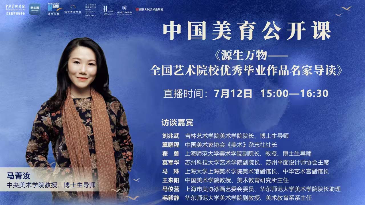 7月12日,中国美育公开课第六十二讲“源生万物——全国艺术院校优秀毕业作品名家导读”在线直播活动举办。中国美育公开课是全国常态化的美育专业课程,以公益云直播的形式,从“大美育”的思想理念出发,涵盖美术、音乐、影视、戏剧等方面,按照不同年龄阶层及需求设置课程主题,打造中国第一个具备连续性、专业性、艺术性与权威性的美育综合在线平台。近年来,中国美育公开课共播出三个系列,分别是:“走进艺术家工作室”系列、“邂逅艺术大师”系列和“暑期特辑”。在经历了全面的升级改版之后,中国美育公开课结合当下社会环境和美育发展诉求,特别推出“走进美术馆”系列,本次课程为第一期。