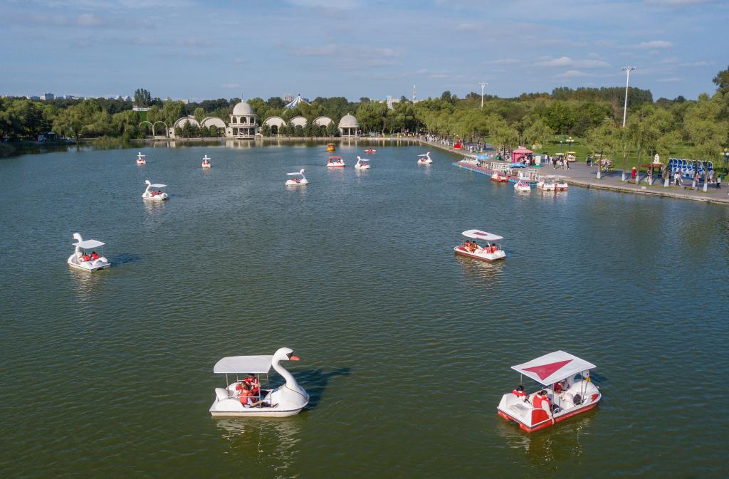 8月20日,游人在太阳岛风景区太阳湖上乘船游览(无人机照片)。