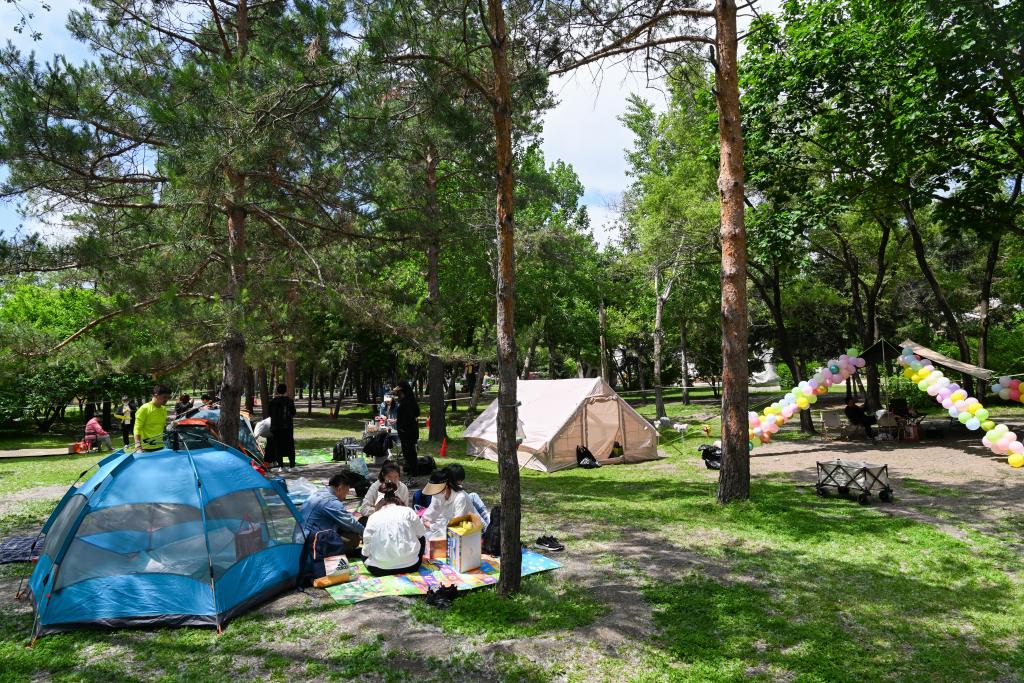 游人在太阳岛风景区露营区体验游玩(6月4日摄)。