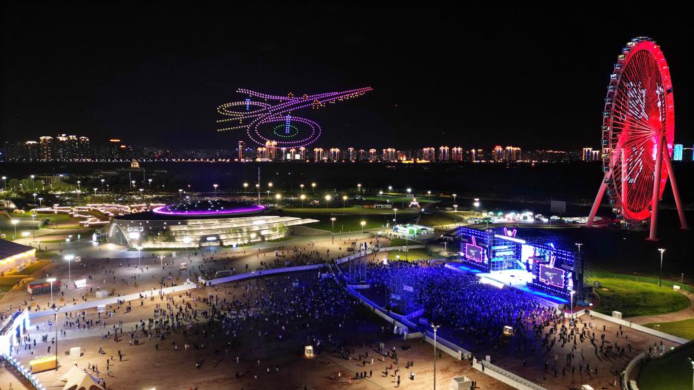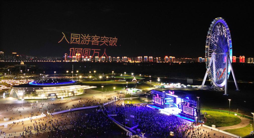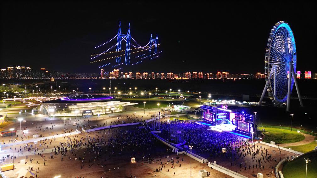 9月1日,第二十二届中国·哈尔滨国际啤酒节闭幕现场上演无人机表演(无人机照片)。