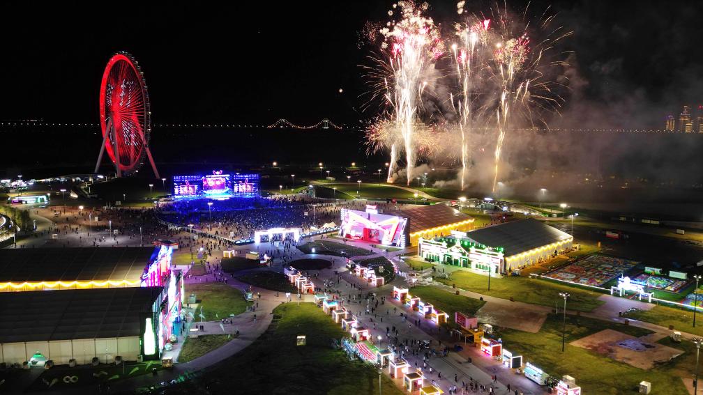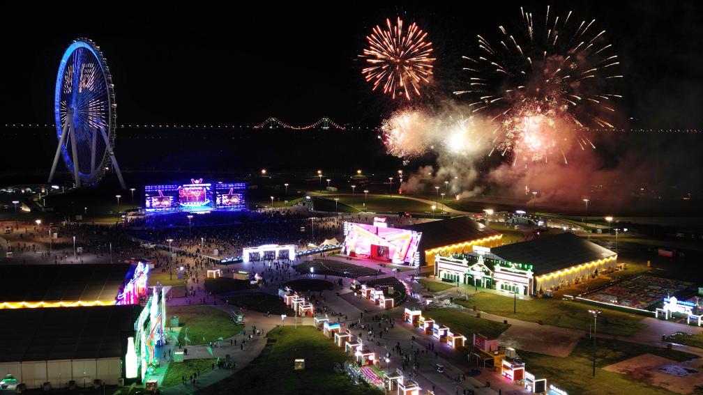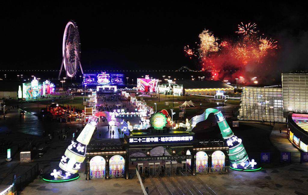 9月1日,第二十二届中国·哈尔滨国际啤酒节闭幕现场上演烟花秀(无人机照片)。
