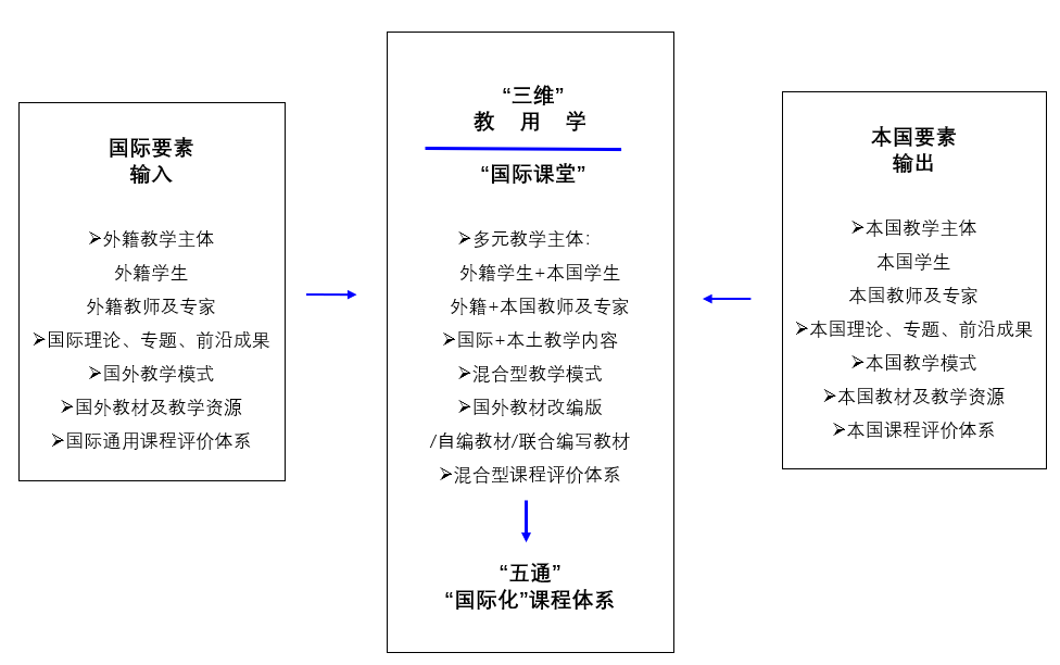所谓“课程国际化”,即立足本土、覆盖全面,基于教育各环节中本土既有的国际要素如课程、教材、教学方式、教学手段、国内、外学者及学生,充分利用现代化信息技术,将国际性、跨文化内容多维度植入课程设置、实施及评价全流程的教学模式。