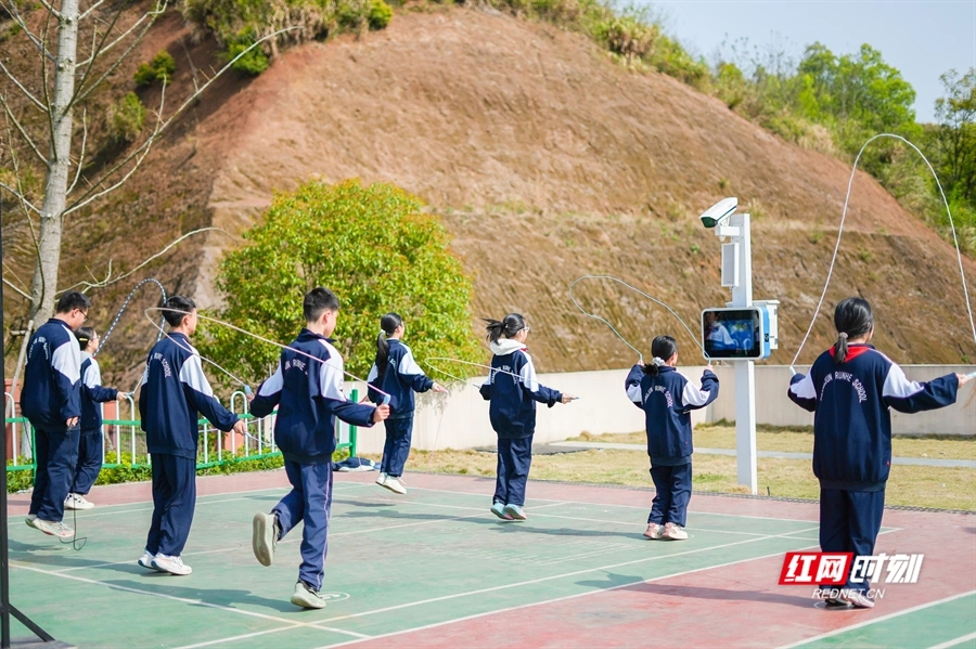 湖南娄底市涟源市长郡蓝田润和学校,学生们运用“智慧操场”进行跳绳比赛。