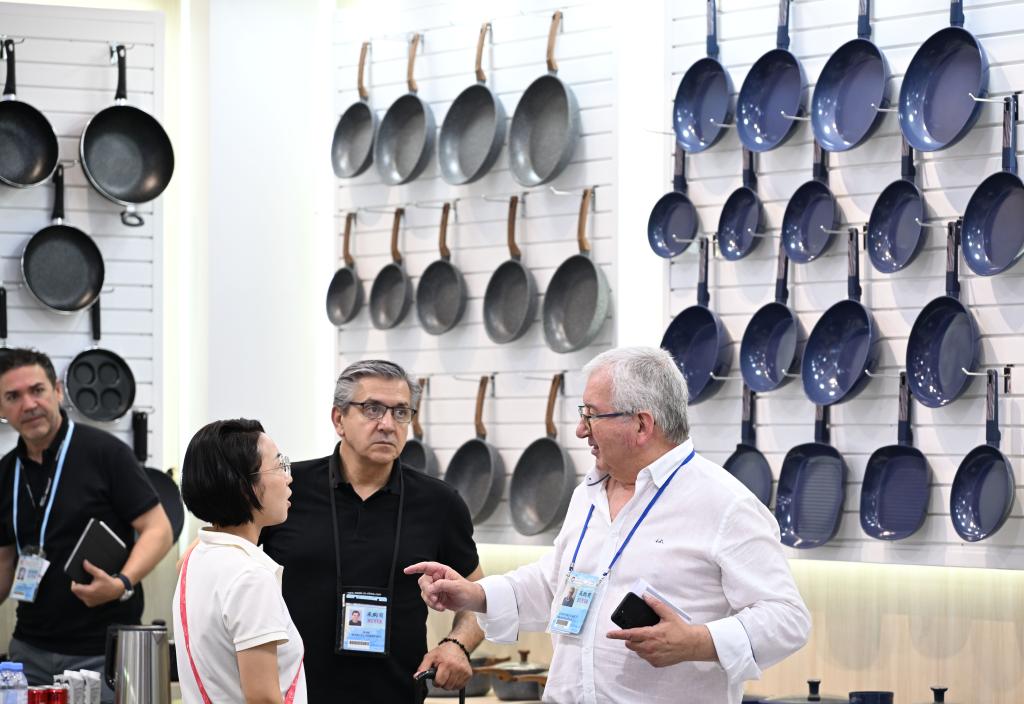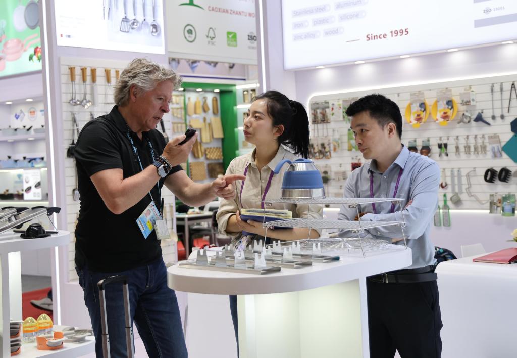 4月23日,在第137届广交会上,境外采购商在厨具展区洽谈。