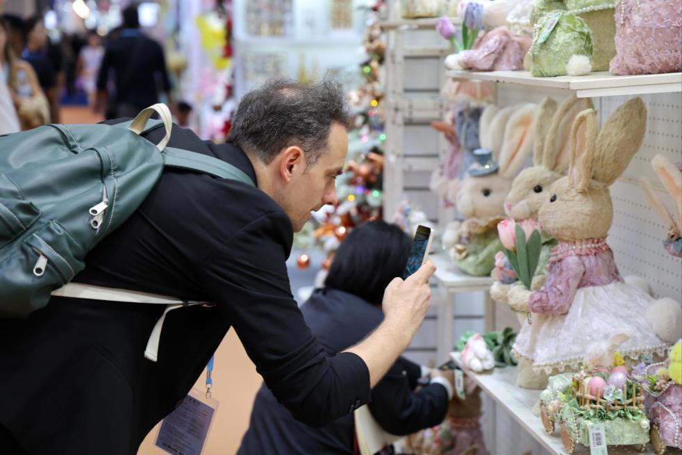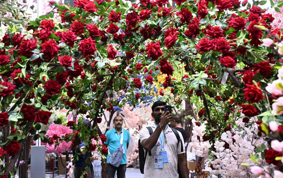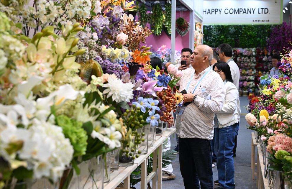 4月23日,在第137届广交会上,境外采购商观看仿真花展区。