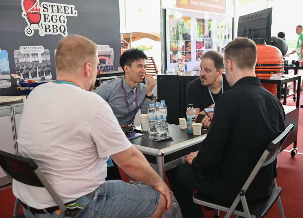4月23日,在第137届广交会上,客商在了解户外烧烤产品。