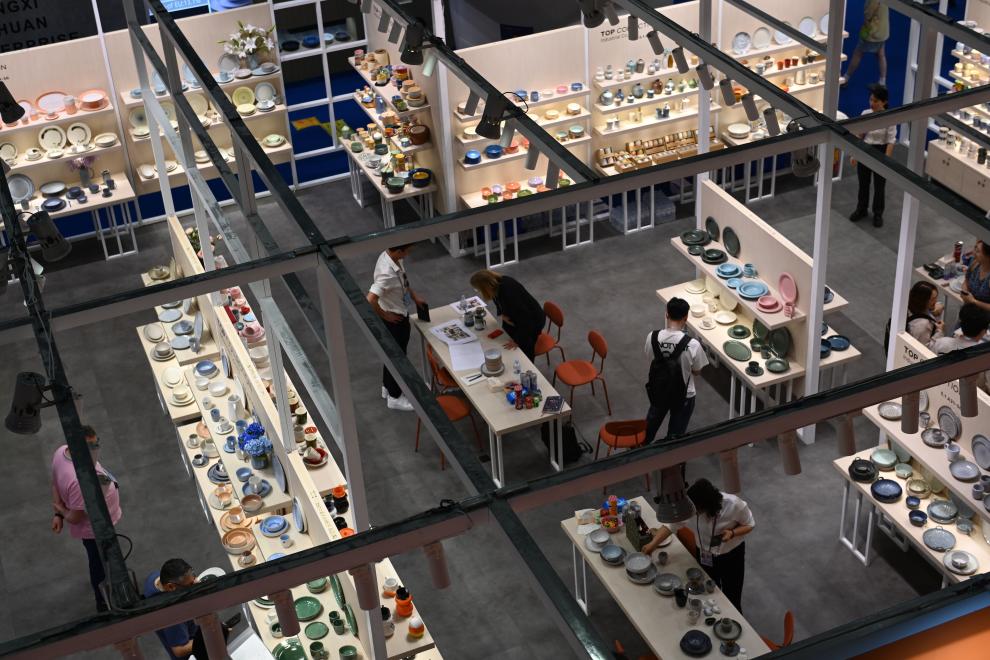4月23日,在第137届广交会上,境外采购商在瓷器展区洽谈。