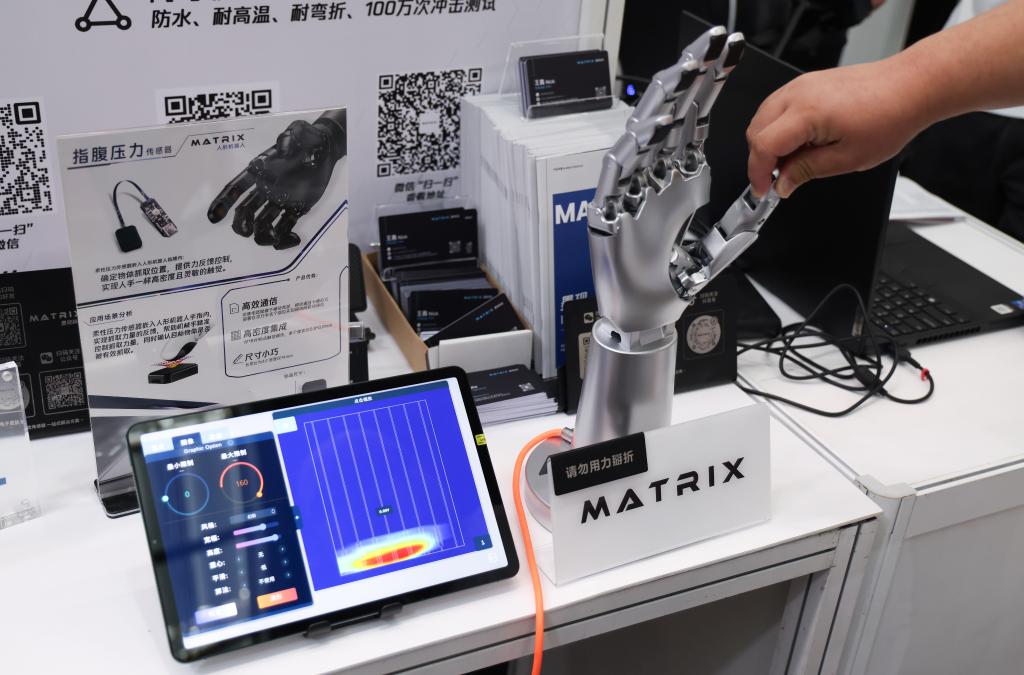 4月24日,一位参观者体验墨现科技(东莞)有限公司展出的指腹压力传感器。