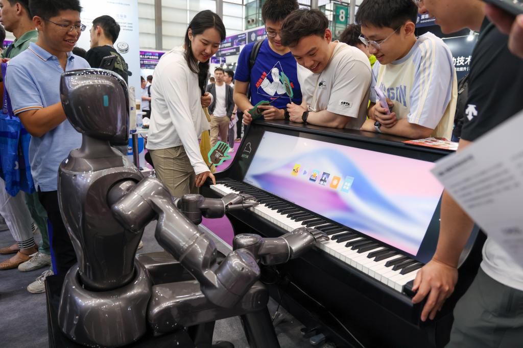 4月24日,参观者观看人形机器人弹钢琴。