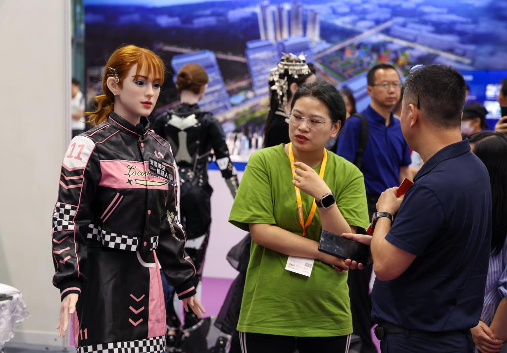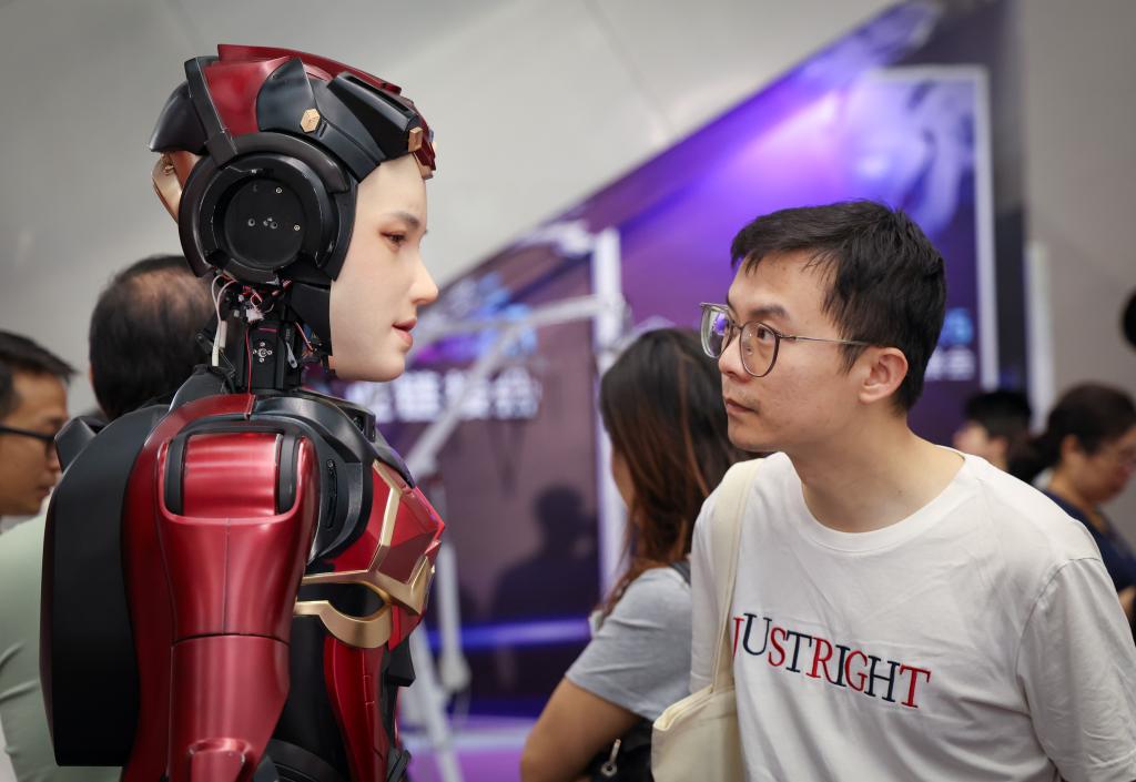 4月24日,参观者在数字华夏展台查看一款具有情感交互能力的人形机器人。