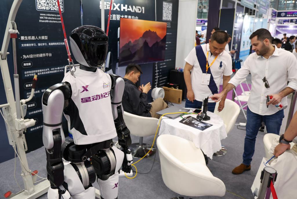 4月24日,外籍参观者在星动纪元展台了解机器人产品。