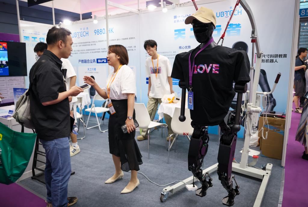 4月24日,参观者在优必选展台了解天工行者机器人。