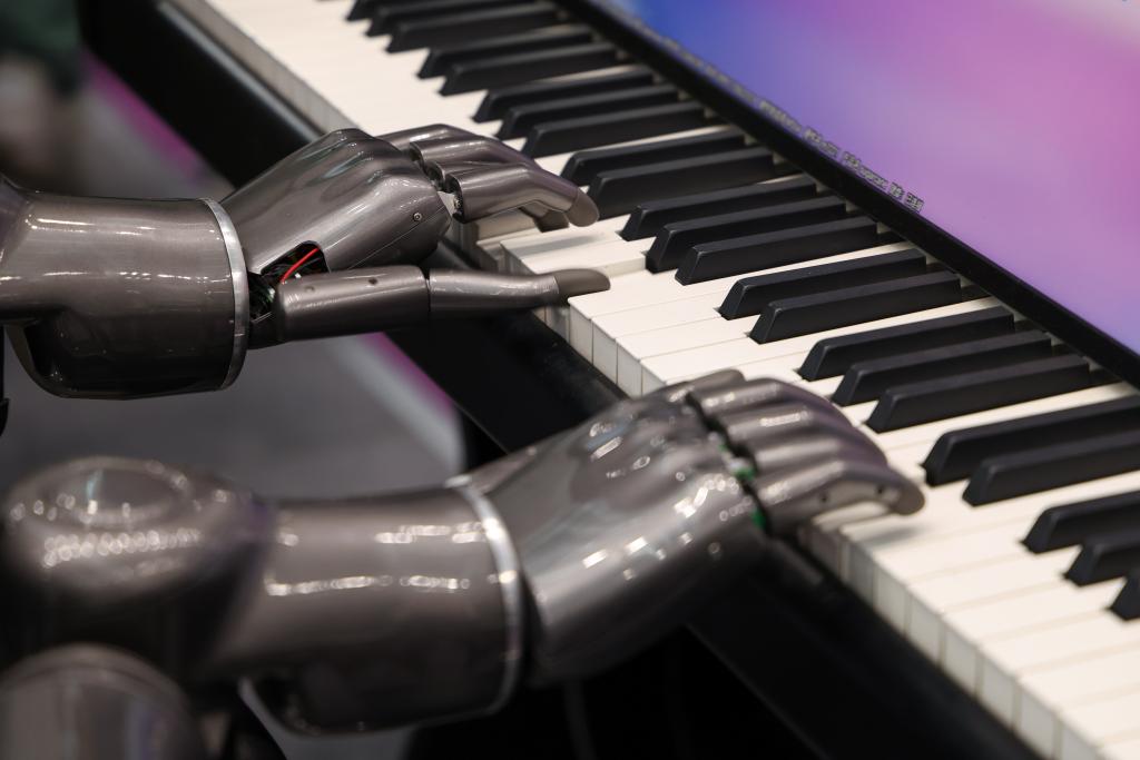 4月24日,人形机器人展示弹钢琴的技能。