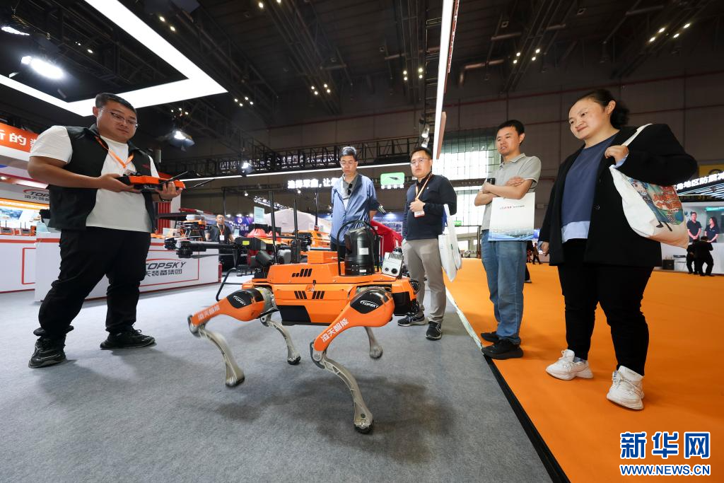 5月13日,在北京凌天智能展位,工作人员为参观者演示可用于应急救援的四足机器狗。