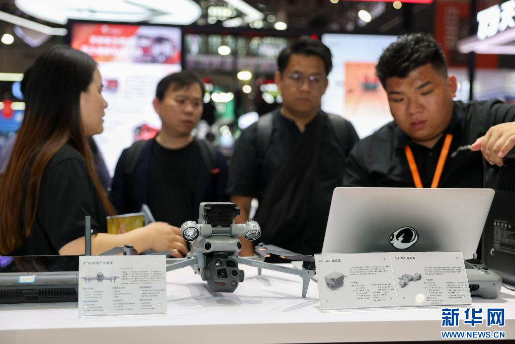 5月13日,参观者在大疆展位了解行业无人机在应急救援中的工作流程。