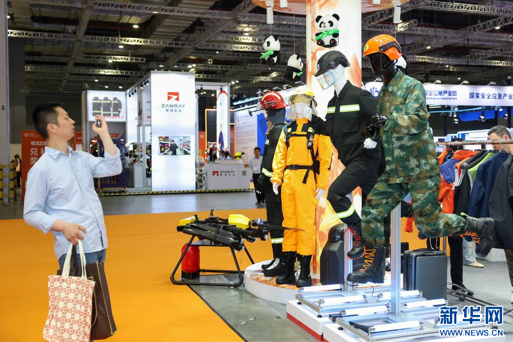 5月13日,参观者拍摄现场展出的防火救援装备。