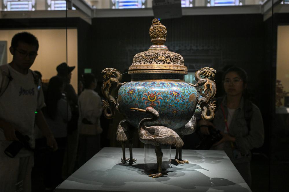 这是展出的清代掐丝珐琅鹤足炉(5月19日摄)。