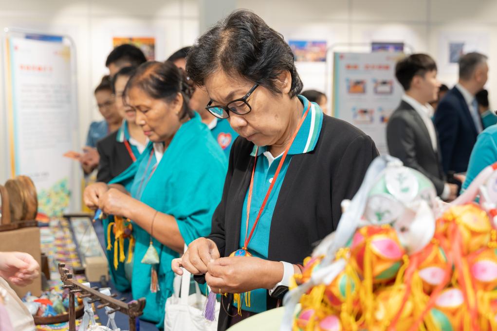 5月16日,老挝民众在首都万象举行的“茶和天下·雅集”暨广西文化旅游推介会上参加壮锦非遗体验活动。