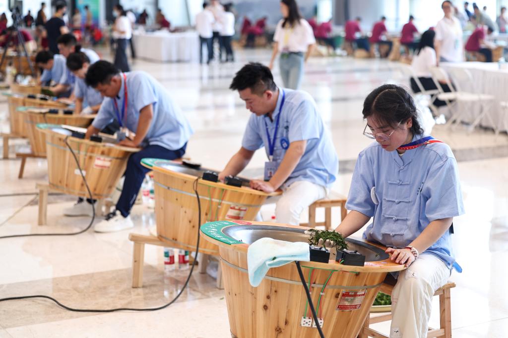 5月21日,参加2025年浙江省龙井茶炒制技能大赛的选手在炒制龙井茶。
