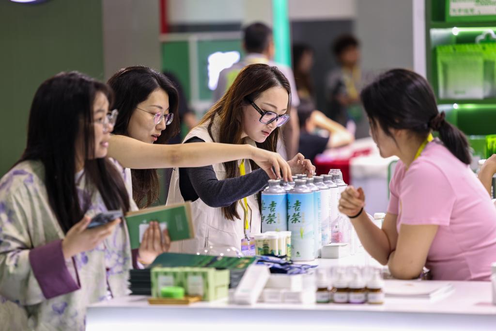 5月21日,观众在第七届中国国际茶叶博览会现场挑选安吉白茶茶饮。