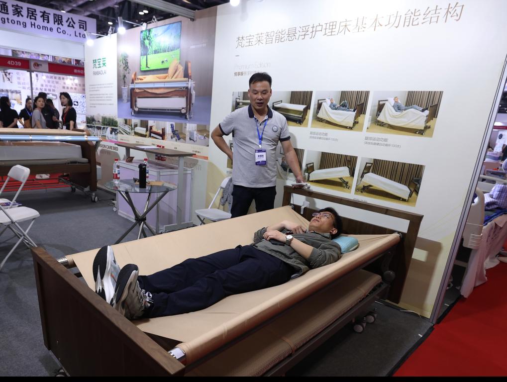5月21日,参观者在体验智能悬浮护理床。