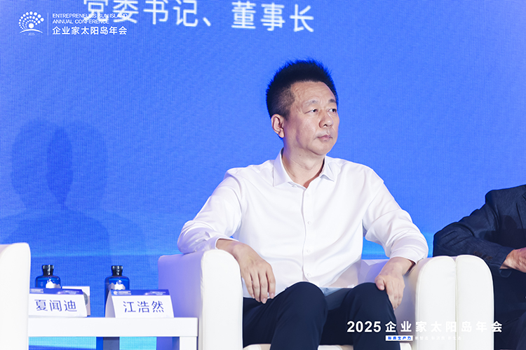 图为第十四届全国政协委员、恒银金融科技股份有限公司党委书记、董事长江浩然8月3日上午在2025企业家太阳岛年会主论坛思客对话环节参与讨论。