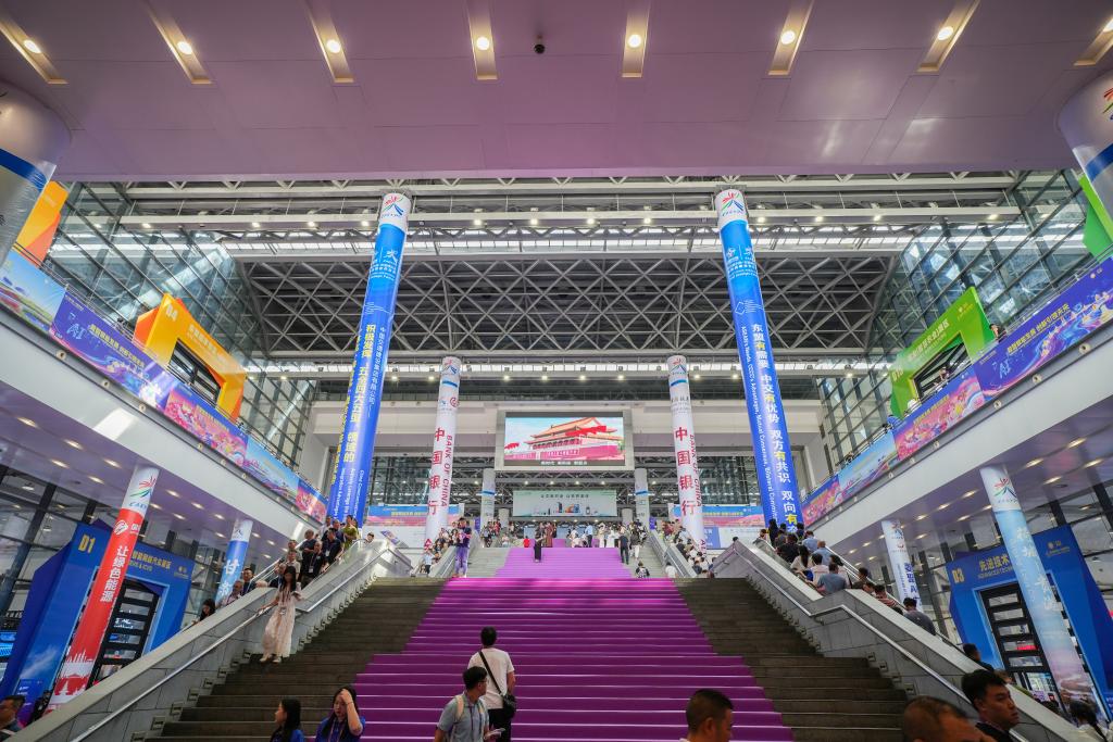 9月17日,在广西南宁国际会展中心,人们从展馆外走过。