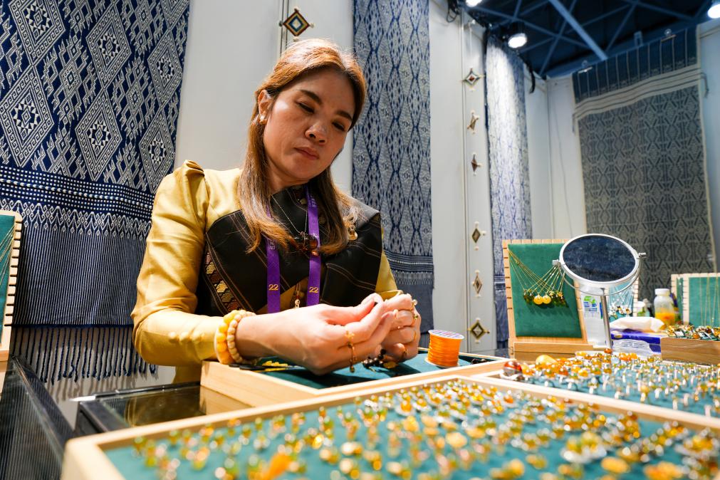 9月17日,东博会参展商在广西南宁国际会展中心内整理商品。