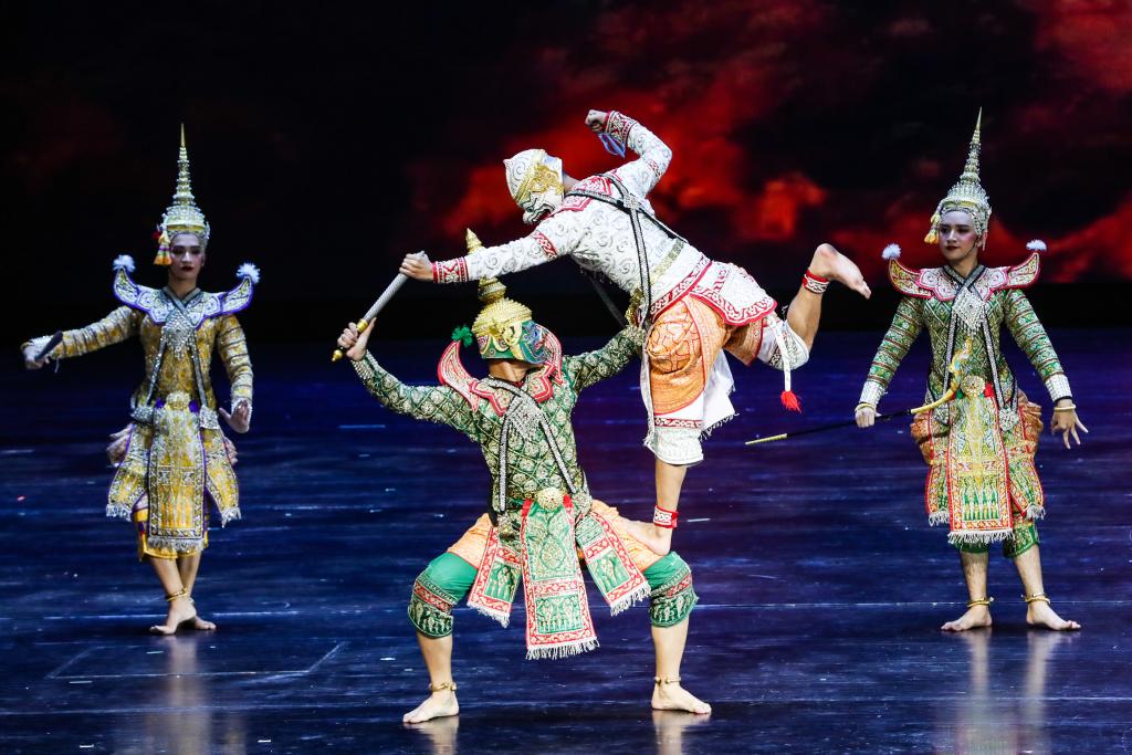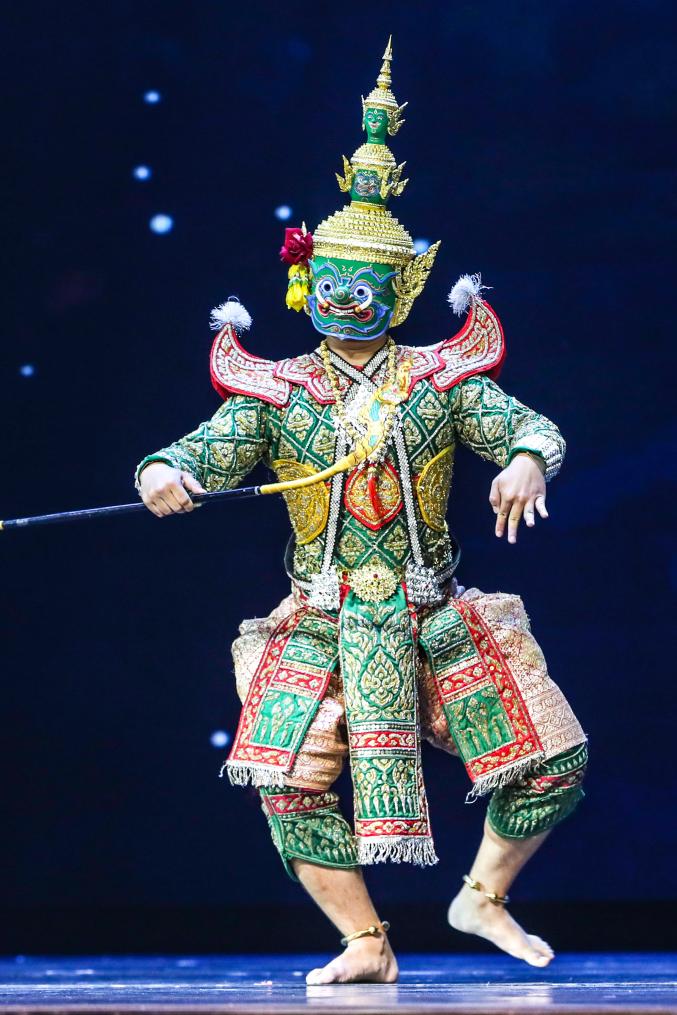 9月22日晚,在“相约敦煌”国际文化交流演出活动现场,来自泰国的演员表演孔剧《拉玛坚》选段。