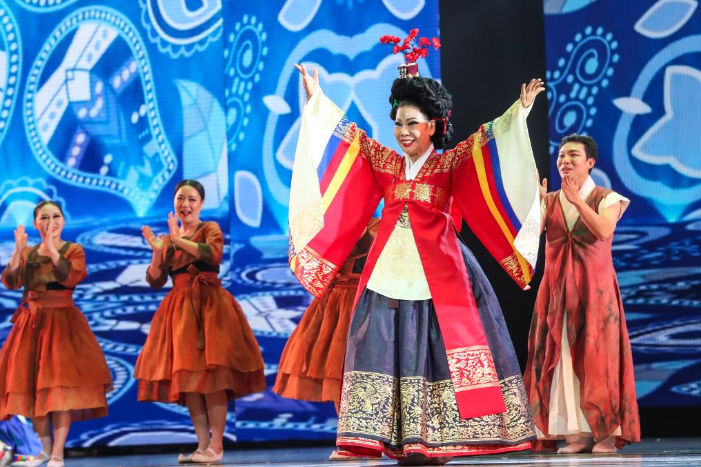 9月22日晚,来自韩国的演员在“相约敦煌”国际文化交流演出活动现场表演民俗舞蹈。