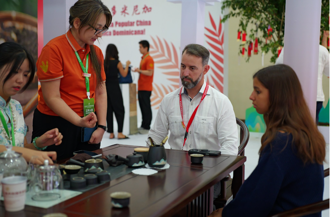 展会特别设立国家形象展示区,通过图片、视频、实物模型,生动呈现中国在科技创新、绿色发展等领域的成果。现场设置的许愿打卡墙、书法和茶艺互动体验区,吸引大量多米尼加民众驻足打卡,沉浸式体验中华优秀文化的魅力,